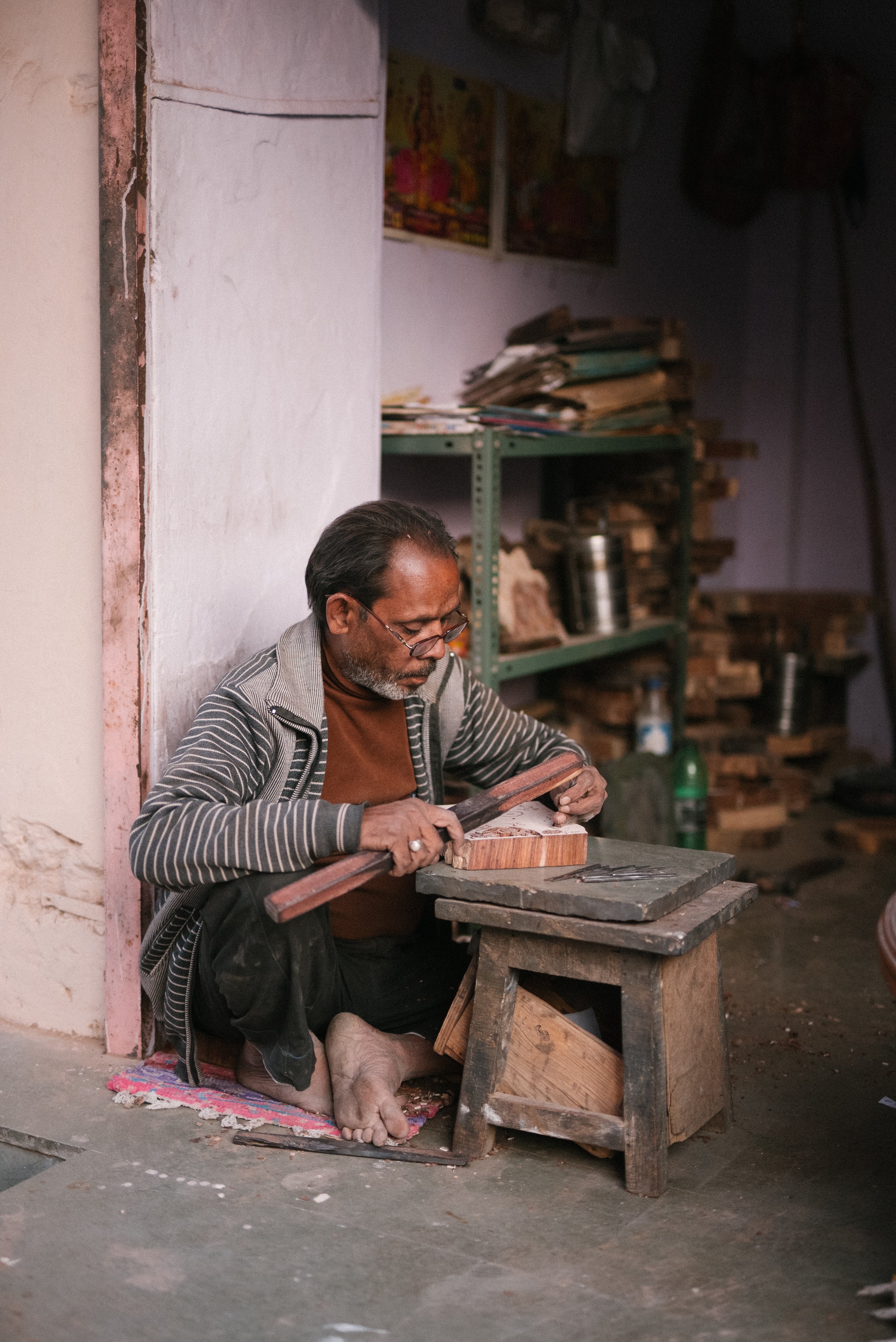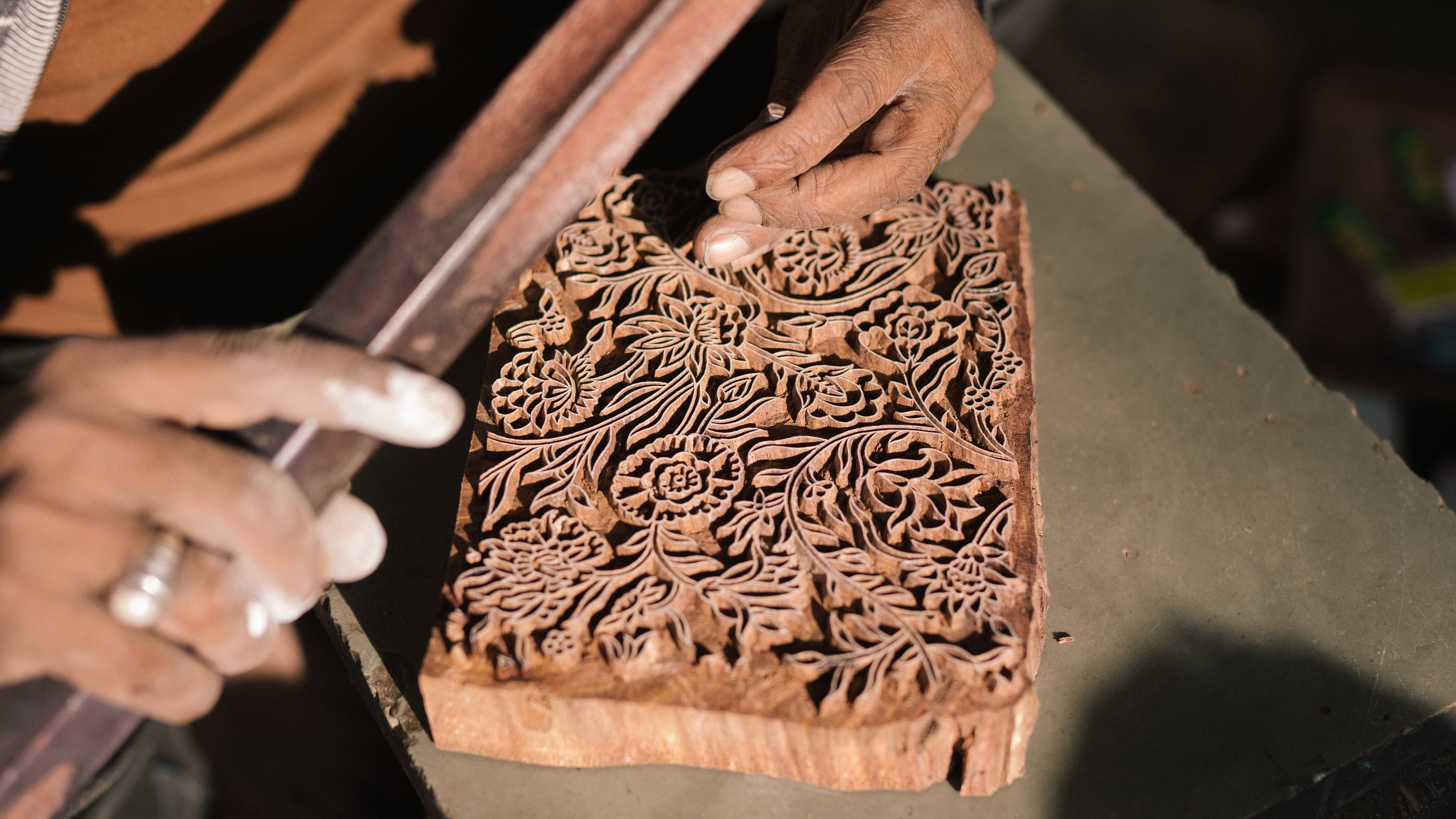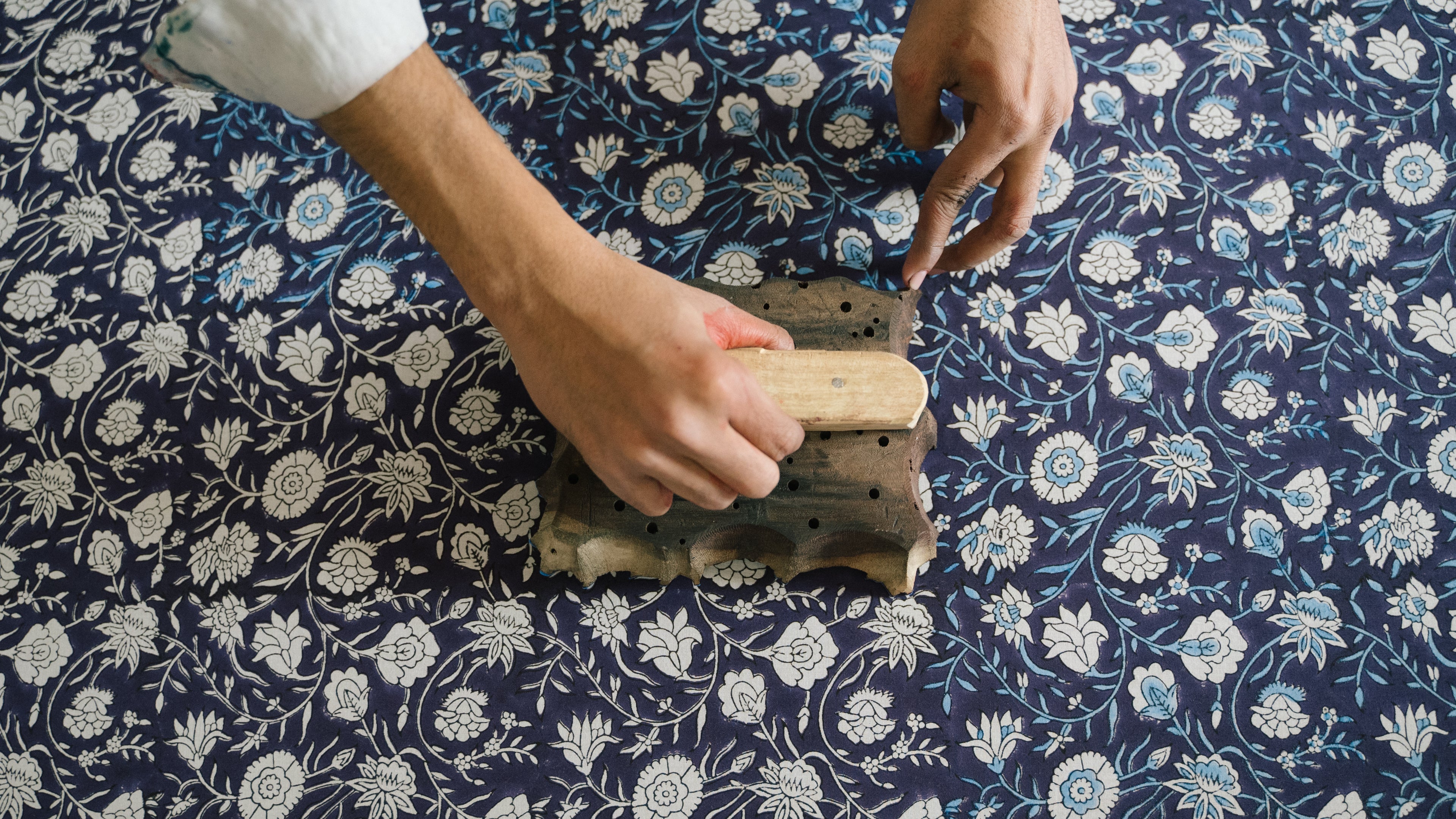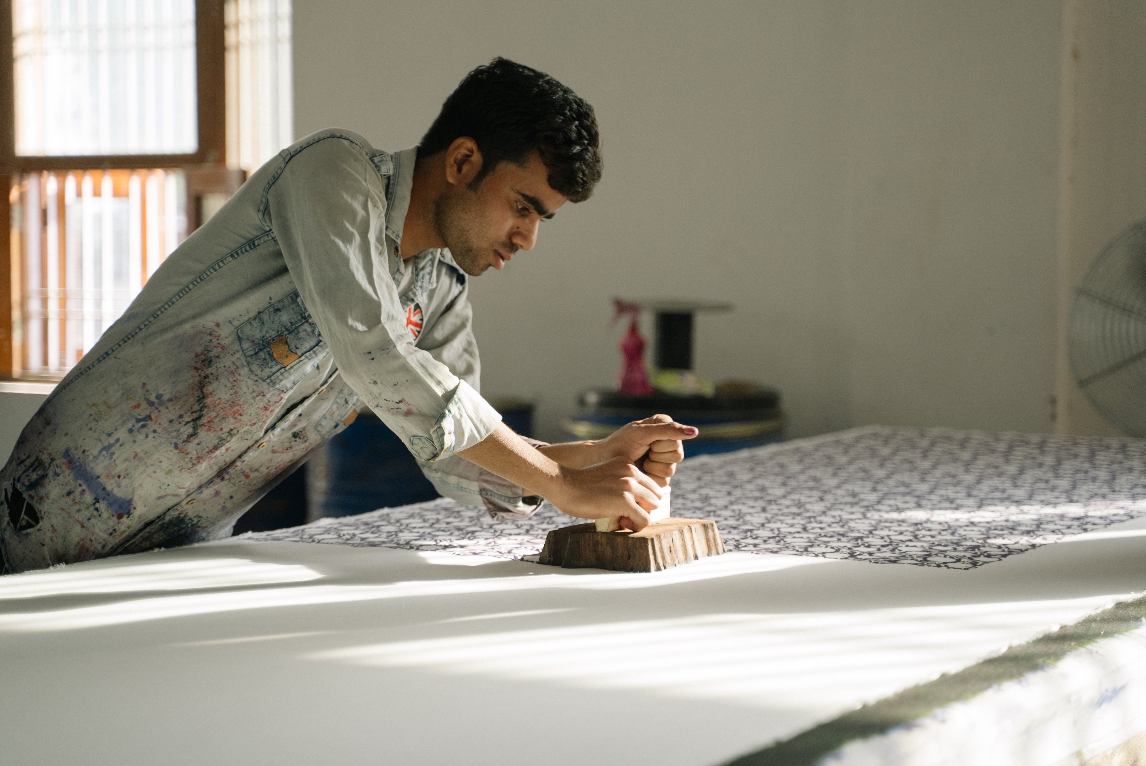 The designs are first sketched by hand and then a CAD is made which is then transferred to a transfer sheet. From a transfer sheet, it is then transferred to a wooden block ready for carving. After the design is carved onto a wooden block it is sent to a fabric printing artisans who then prints the fabric with these wooden blocks.